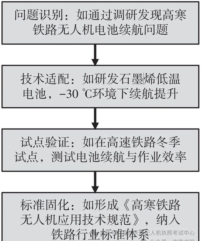 为推进铁路低空无人机应用从单点/局部调查向全线智能巡查转型,需系统解决标准缺失、空域审批、安全控制、技术整合与人才短缺等关键问题,建议采用“问题识别-技术适配-试点验证-标准固化”的闭环实施流程,铁路低空无人机应用实施流程如下图所示,协同推进技术迭代与产业升级。