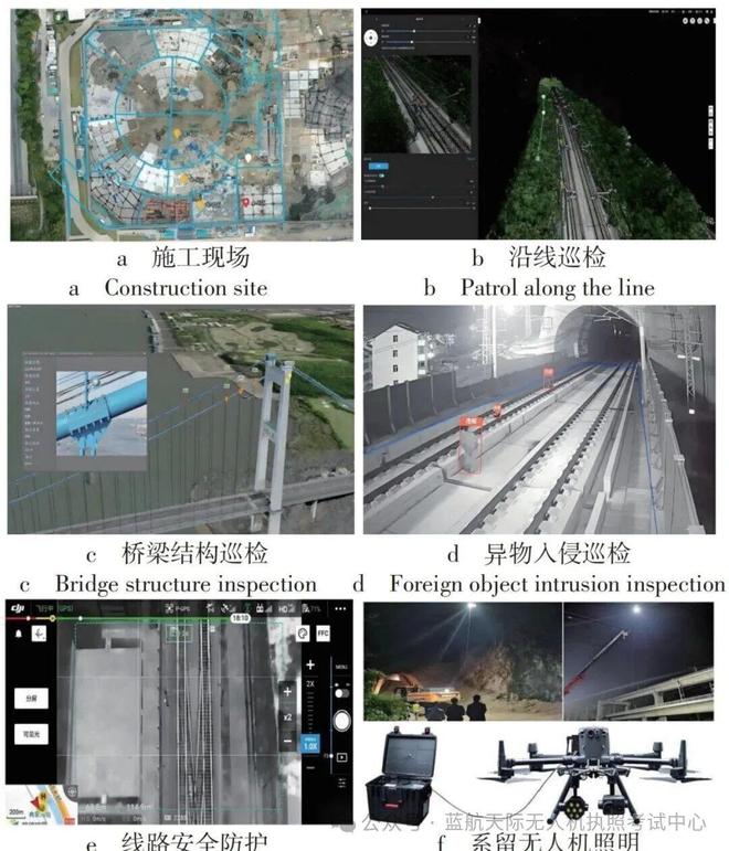 在洪涝、事故等导致铁路中断需紧急抢通时,系留无人机可提供持续、灵活的空基照明支持,如上图f所示。其具备3项优势:一是在夜间施工中可配合大功率云台照明灯长时间悬停,提供高亮度、广范围照明,保障作业安全与进度;二是照明亮度可达3万lm以上,功率达300 W,照明范围可随飞行高度灵活调整;三是灯光可与云台相机联动,克服传统地面照明灵活性不足的局限。